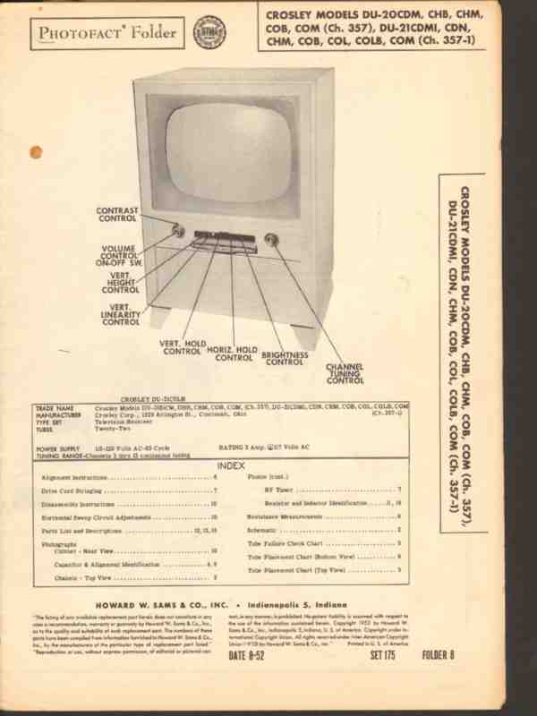 Vintage CROSLEY models DU-20CDM, DU-20CHB, DU-20CHM, DU-20COB, DU-20COM (Ch. 357), DU-21CDMI, DU-21CDN, DU-21CHM, DU-21COB, DU-21COL, DU-21COLB and DU-21COM (Ch. 357-1) TV television receiver. Original old Sams Photofact manual includes schematic, layouts, alignment info, voltage & resistance test chart, repair parts list. 16 pages. Dated 1952. Crosley Corp. of Cincinnati, OH. This manual would make a sensational accompaniment to your vintage video TV equipment.