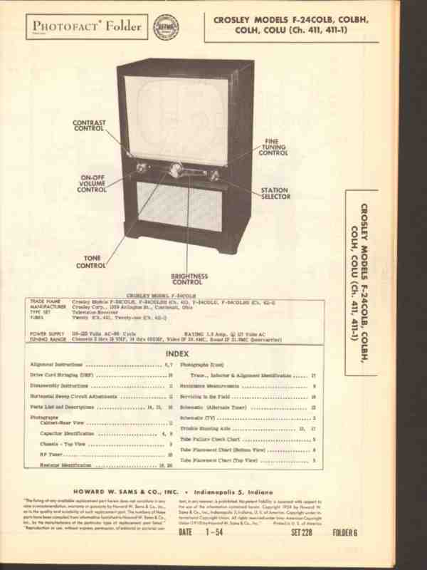 Vintage CROSLEY models F-24COLB, F-24COLBH, F-24COLH and F-24COLU (Ch. 411 and 411-1) TV television receiver. Original old Sams Photofact manual includes schematic, layout, alignment instructions, voltage & resistance test chart, repair parts list. 20 pages. Dated 1954. Crosley Corp. of Cincinnati, OH. This manual would make a sensational accompaniment to your classic video TV equipment.