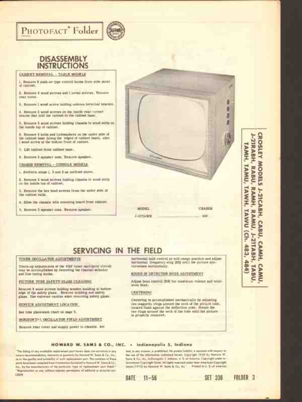 Vintage CROSLEY models J-21CABH, J-21CABU, J-21CAMH, J-21CAMU, J-21RABH, J-21RABU,. J-21RAMH, J-21RAMU, J-21TABH, J-21TABU, J-21TAMH, J-21TAMU, J-21TAWH and J-21TAWU (Ch. 483 and 484) TV television receiver. Original old Sams Photofact manual includes schematic, layout, alignment instructions, voltage & resistance test chart, repair parts list and description. 16 pages. Dated 1956. This manual would make a sensational accompaniment to your classic video TV equipment.