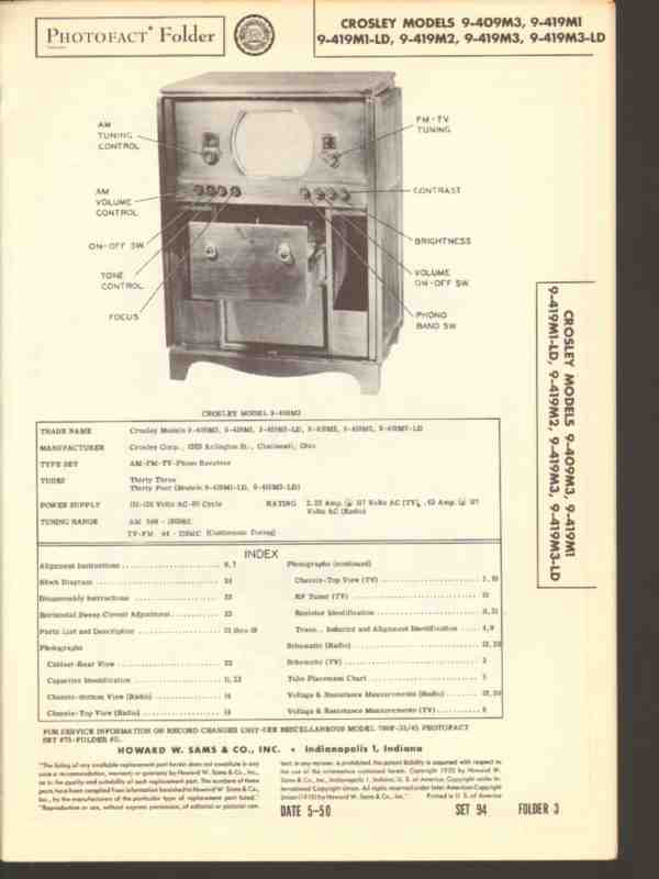 Vintage CROSLEY models 9-409M3, 9-419M1, 9-419M1-LD, 9-419M2, 9-419M3, 9-419M3-LD 33 tube AM FM radio TV television receiver with phonograph record player. Original old Sams Photofact manual includes schematic, layouts, alignment info, voltage test charts, repair parts list. 24 pages. Dated 1950. Crosley Corp. of Cincinnati, OH. This manual would make a sensational accompaniment to your vintage audio / video equipment.