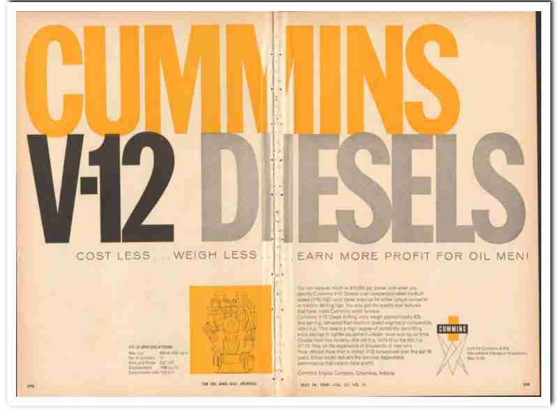 Cummins Engine Company 1959 Vintage Ad V-12 Diesels Oilfield Profit
