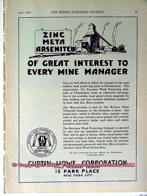 Original vintage mining magazine ad, CURTIN-HOWE CORPORATION of New York City, NY. The Keystone Wood Preserving Company of Philadelphia, PA. uses Zinc Meta-Arsenite as a wood preservative for mine timbers. The Western Union Telegraph Company uses Zinc Meta-Arsenite for the treatment of poles. Old 1928 mining industry advertisement.