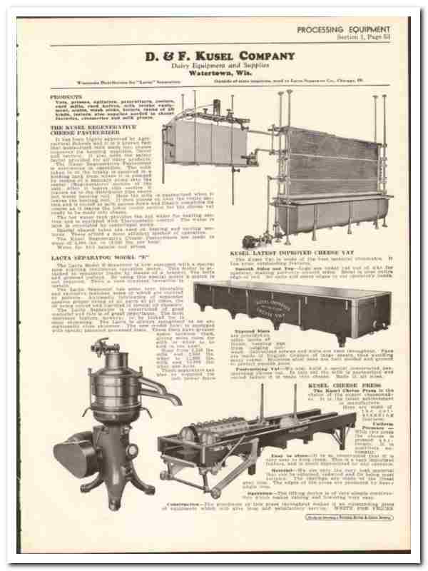 Products include the Kusel Regenerative Cheese Pasteurizer, Lacta Separator Model 'E', Kusel Latest Improved Cheese Vat and the Kusel Cheese Press, all are fully featured.