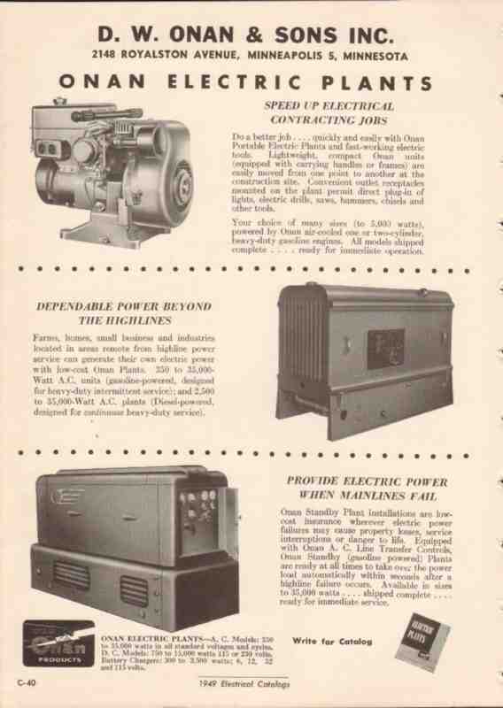 D W Onan Sons Inc 1949 Vintage Catalog Electric Power Plants Standby