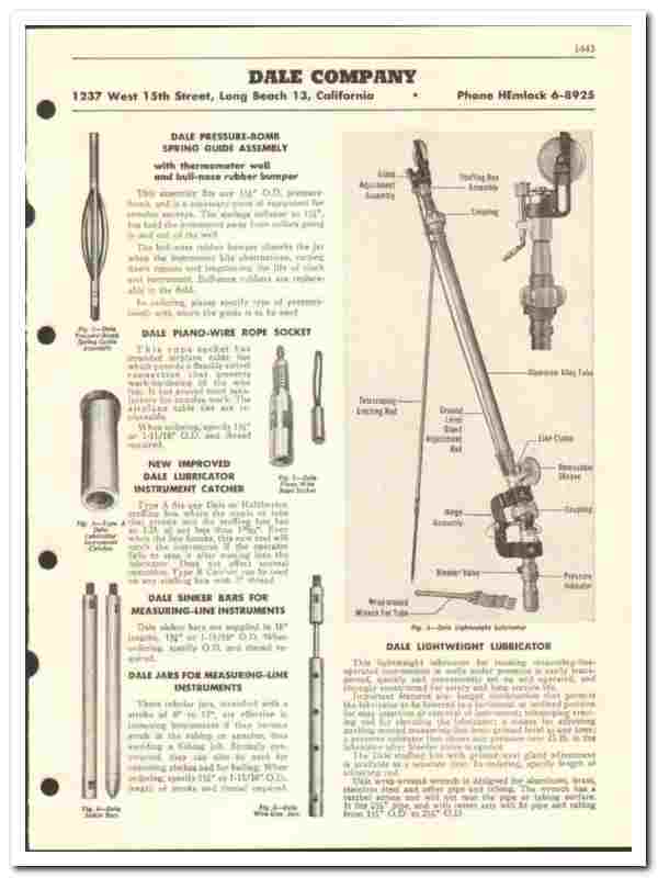 Products include the Dale Pressure-Bomb Spring Guide Assembly, Piano-Wire Rope Socket, Lubricator Instrument Catcher, Sinker Bars for Measuring-Line Instruments, Jars for Measuring-Line Instruments and the Dale Lightweight Lubricator, all are fully featured.