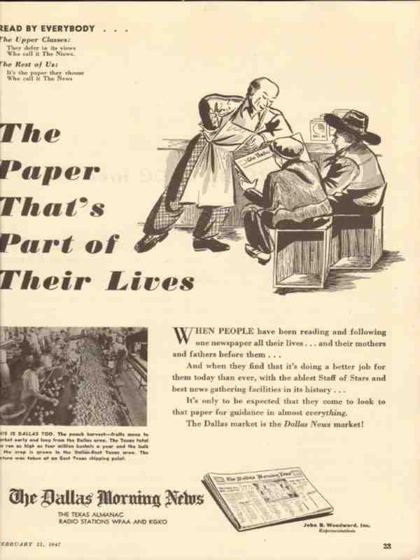 Original vintage media trade magazine ad for THE DALLAS MORNING NEWS Newspaper. The Paper That's Part of Their Lives. Peaches at a East Texas shipping point are pictured. John B. Woodward, Inc. Representatives. The Texas Almanac, Radio Stations WFAA and KGKO. Old 1947 magazine advertising industry advertisement, would display beautifully matted and framed.