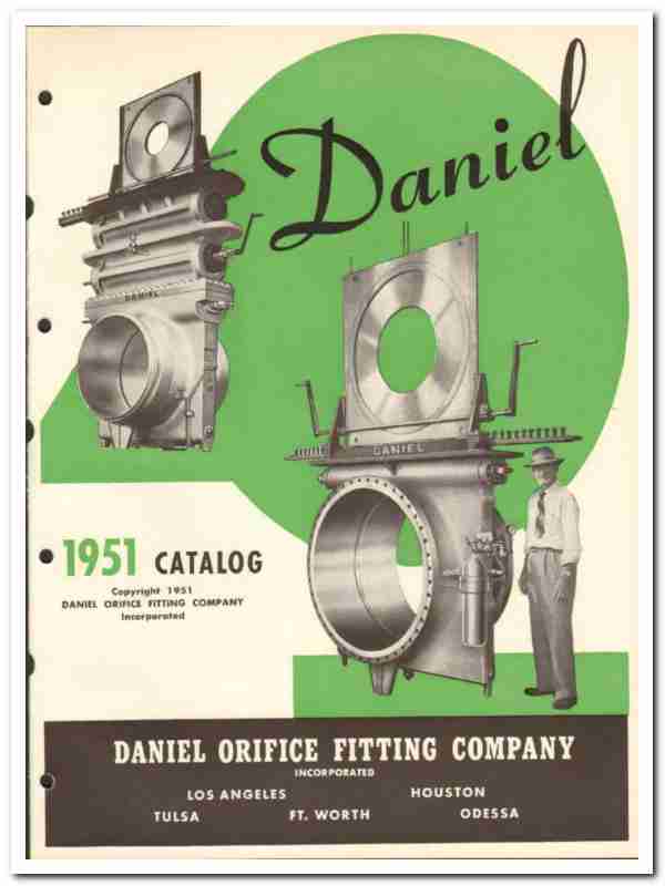 Original 1951 Oil and Gas trade vintage catalog for the DANIEL ORIFICE FITTING COMPANY. Main office and plant was located at 3344-3352 Union Pacific Avenue, Los Angeles, CA. and at 5405 Clinton Drive, Houston, TX.