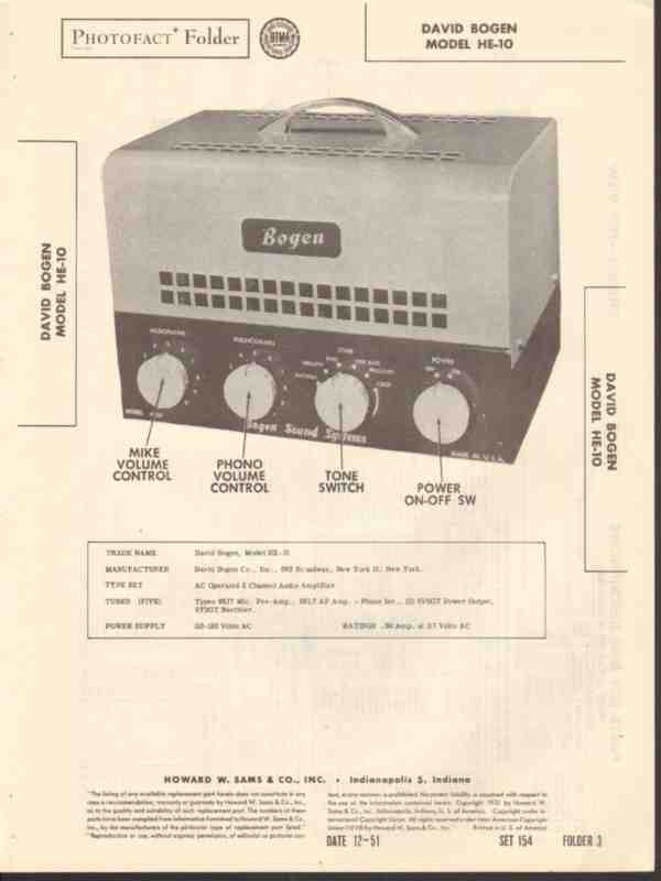 Vintage DAVID BOGEN model HE-10 2 channel audio amplifier. Original old Sams Photofact manual with schematics, layouts, voltage & resistance readings, and parts list . 4 pages. Dated 1951. David Bogen Company, Inc. of New York City, NY. This would make a sensational accompaniment to your vintage audio equipment.
