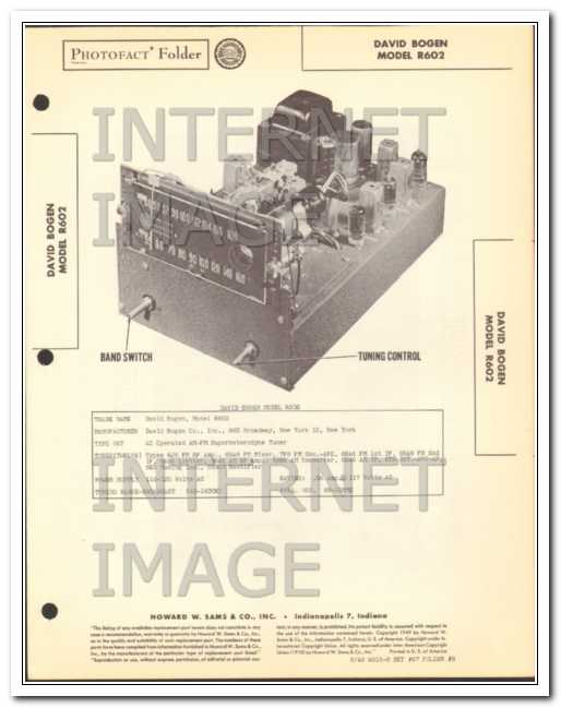 Vintage DAVID BOGEN model R602 12 tube Superheterodyne AM FM radio tuner. Original old Sams Photofact manual includes schematic, layout, voltage & resistance test charts, repair parts list. 8 pages. Dated 1949. David Bogen Company, INC. of New York, NY. This manual would make a sensational accompaniment to your vintage audio equipment.