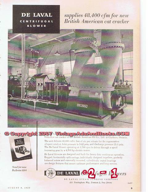 Original oil and gas trade magazine vintage ad for THE DAVISON CHEMICAL COMPANY of Baltimore, MD. Division of W.R. Grace and Company. Davison M-S High Alumina Catalyst. Shows chart of High Alumina M-S Catalyst Particle Size Distribution. Unique 1955 old petroleum petrochemical refining industry magazine advertisement. On the reverse side is an ad for DE LAVAL STEAM TURBINE COMPANY of Trenton, NJ. DeLaval Centrifugal Blower does a dependable job in the new Model B Orthoflow cat cracker of the British American Oil Company, Ltd. at Clarkson, Ontario. Old 1955 petroleum industry magazine advertisement. Approximate page size 9 x 12 inches.