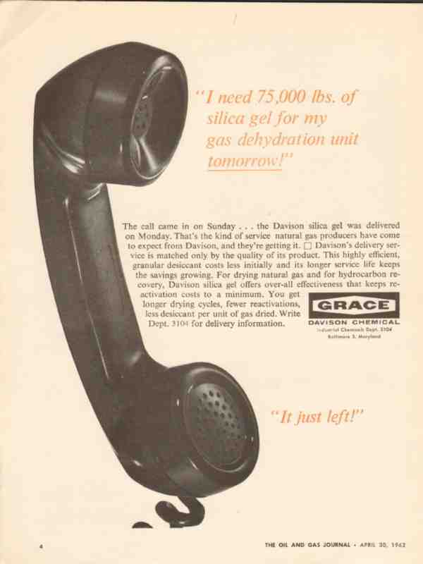 Original old petroleum industry trade magazine ad for DAVISON CHEMICAL CORPORATION of Baltimore, MD. I Need 75,000 pounds of Silica Gel for My Gas Dehydration Unit Tomorrow! This 1962 oil and gas industry magazine advertisement would display beautifully matted and framed.