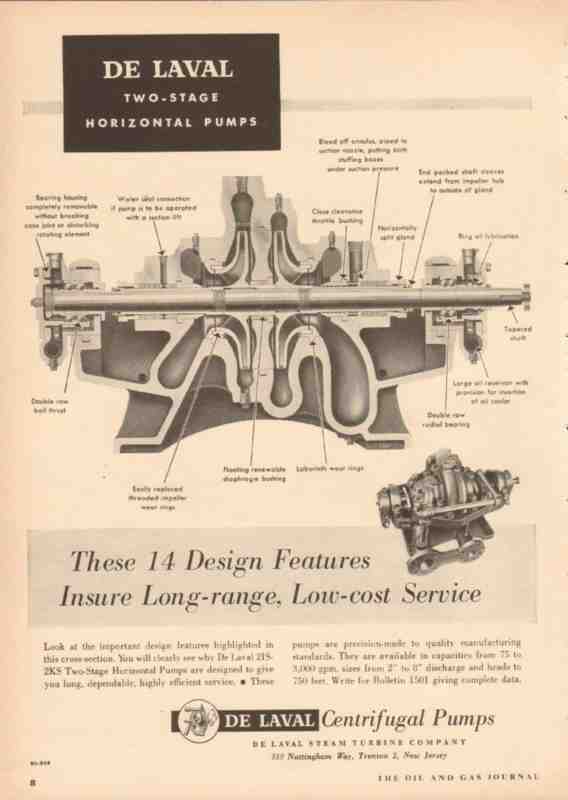 Original oil and gas trade magazine vintage ad for DE LAVAL STEAM TURBINE COMPANY of Trenton, NJ. 2-stage horizontal pumps. These 14 design features insure long-range, low cost service. Double row ball thrust, threaded impeller wear rings, radial bearing, tapered shaft. This unique 1955 old petroleum pump equipment magazine advertisement would display beautifully matted and framed. Nice graphics.