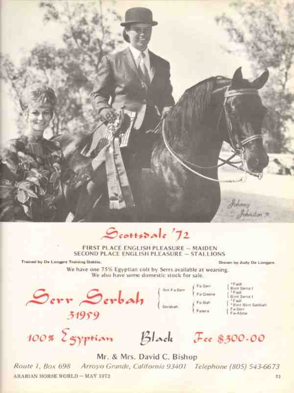 Original old equestrian trade magazine vintage ad for DE LONGPRE TRAINING STABLES horse ranch. Serr Serbah 31959 standing stud. 100 percent Egyptian. Sire Ibn Fa-Serr, dam Serabah. Lineage includes Fa-Serr, Fa-Deene, Fa-Bah, Fasera, Fadl Bint Serra I, Bint Bint Sabbah, Fa-Abba. Owners Mr and Mrs David C. Bishop. Shown by Judy De Longpre. Photo by Johnny Johnston. This unique 1972 Arabian breeding advertisement would display beautifully matted and framed.