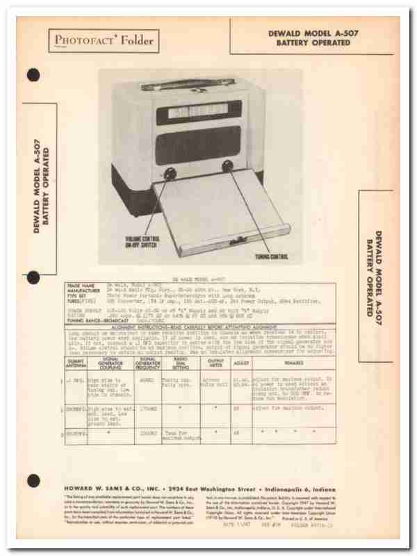 de wald model a-507 5-tube am radio receiver sams photofact manual