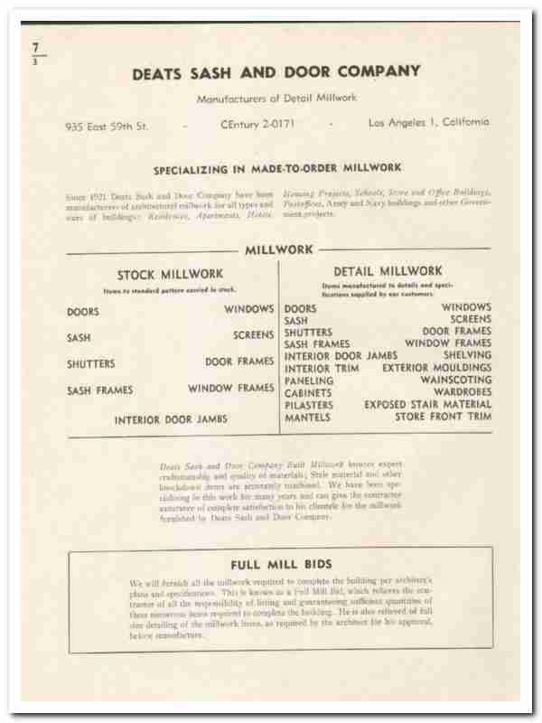 Original 1948 wood trade vintage catalog for the DEATS SASH & DOOR COMPANY. Main office and plant was located at 935 East 59th Street, Los Angeles, CA.