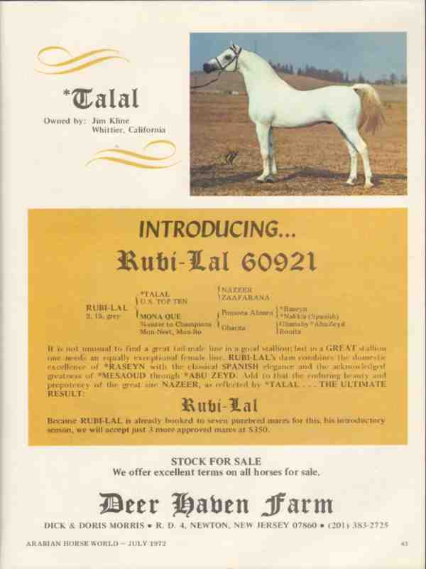 Original old equestrian trade magazine vintage ad for DEER HAVEN FARM in Newton, NJ. Rubi-Lal sire Talal dam Mona Que Arabian horse up for stud. Lineage includes Nazeer, Zaafarana, Pomona Ahmen, Gharita, Raseyn, Nakkla, Gharis, Bonita. Owned by Jim Kline of Whittier, California. Dick and Doris Morris farm owners. This unique 1972 horse breeding advertisement would display beautifully matted and framed.