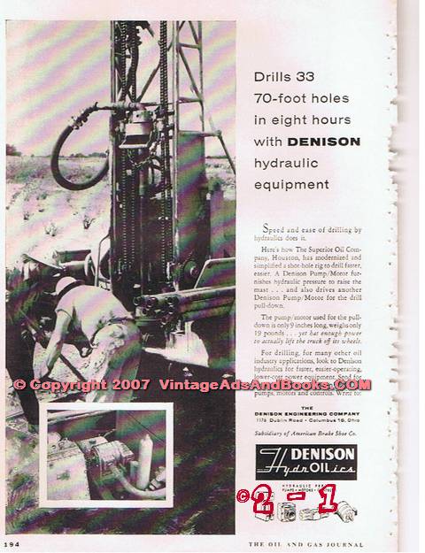 Original oil and gas trade magazine vintage ad for THE DENISON ENGINEERING COMPANY, of Columbus, OH. Denison Hydraulics, Hydraulic Presses, Pumps, Motors, Controls. For complete hydraulic service from one dependable source. Subsidiary of American Brake Shoe Company. Unique 1955 old petroleum industry magazine advertisement. Approximate size 9 x 12 inches.