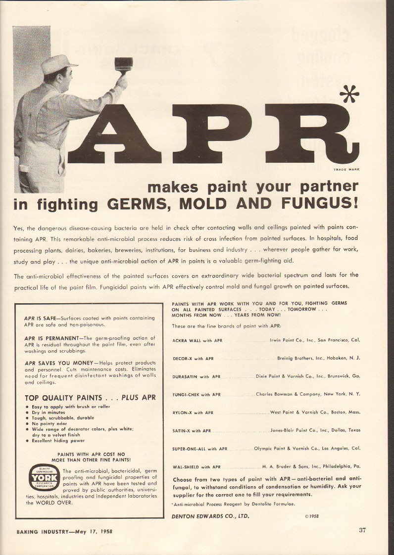 Original commercial bakery trade magazine vintage ad for DENTON EDWARDS COMPANY LTD. APR makes paint your partner in fighting germs, mold and fungus! Anti-microbial process reduces risk of cross infection from painted surfaces. Used in hospitals, food processing plants, dairies bakeries, breweries. 1958 unique old baking industry advertisement.