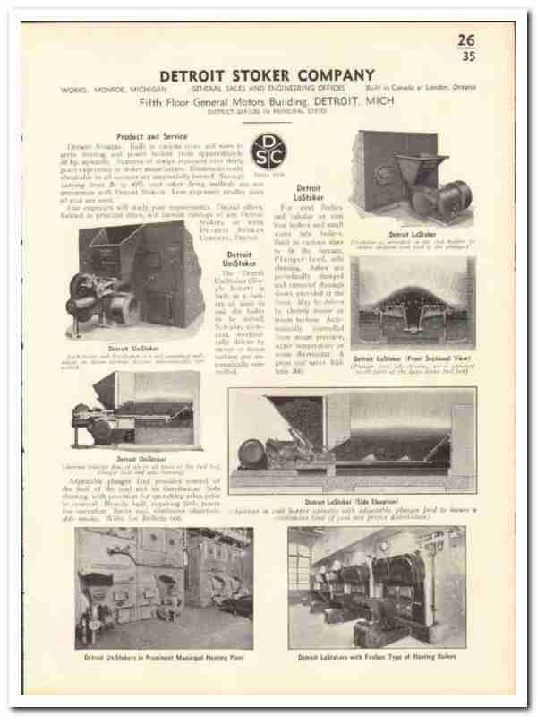 Original heating trade vintage catalog for DETROIT STOKER COMPANY. Main office was located at Fifth Floor General Motors Building, Detroit, Michigan. The plant was located in Monroe, Michigan. Since 1898.