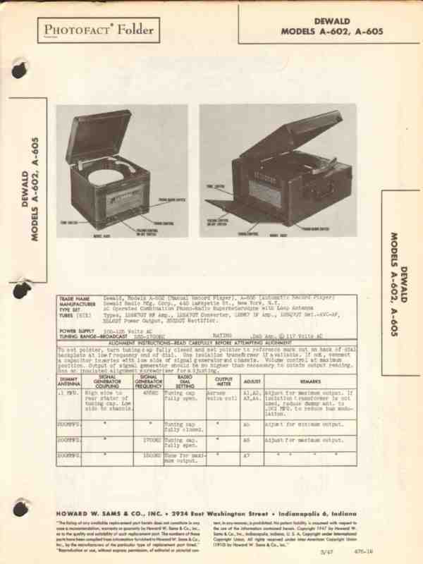 dewald model a602 a605 am radio receiver phono sams photofact manual