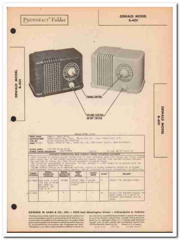 Vintage Radio Service Manual - DEWALD model B-401 4-tube AC-DC operated AM radio TRF receiver.  Manufactured by Dewald Radio Manufacturing Company, of Long Island City, NY. Dated 1948. 4 pages. Original old Sams Photofact manual includes schematic, layout, alignment instructions, voltage & resistance test chart, repair parts list and description. This manual would make a sensational accompaniment to your retro audio equipment.