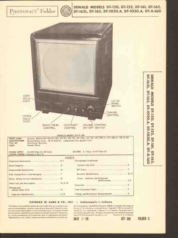 Vintage DEWALD model DT-120, DT-122, DT-161, DT-162, DT-162L, DT-163, DT-1020, DT-1020A, DT-1030, DT-1030A and DT-X-160 23 tube TV television receiver. Original old Sams Photofact manual includes schematic, alignment info, voltage & resistance test charts, repair parts list. 19 pages. Dated 1950. DeWald Radio Manufacturing Corp. Of Long Island City, NY.