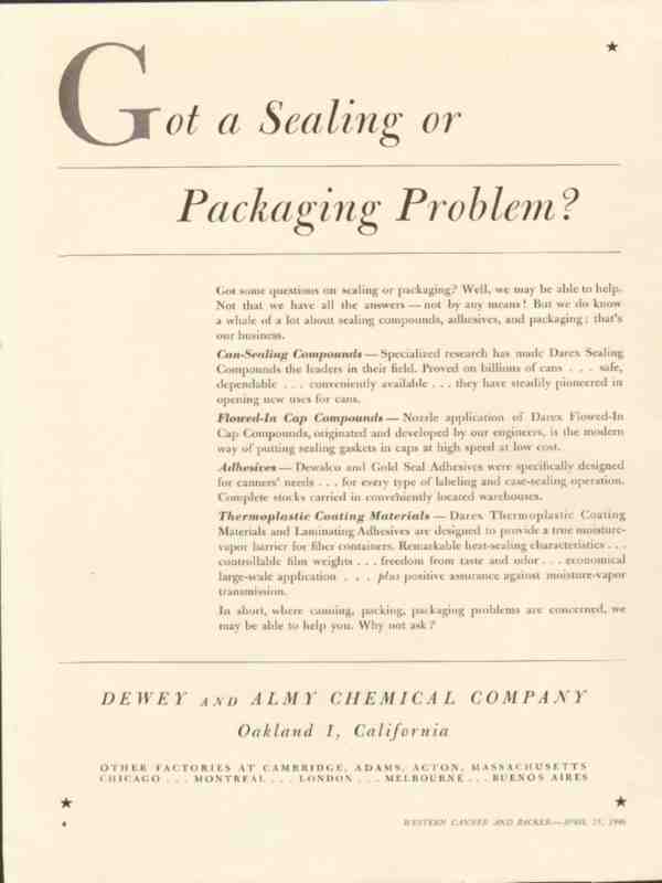 Original vintage food packing industry trade magazine ad for DEWEY AND ALMY CHEMICAL COMPANY of Oakland, CA. Got a Sealing or Packaging Problem? Can Sealing Compounds, Flowed-In Cap Compounds, Adhesives, Thermoplastic Coating Material. Old 1946 canning and processing advertisement.