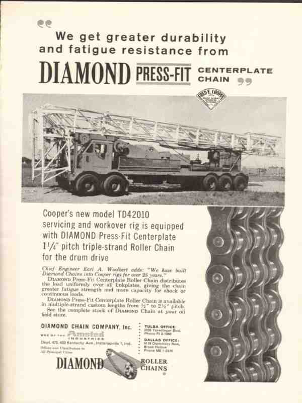 Original oil and gas trade magazine vintage ad for DIAMOND CHAIN COMPANY, INC. was located at 402 Kentucky Avenue, Indianapolis, IN. We Get Greater Durability and Fatigue Resistance from Diamond Press-Fit Centerplate Chain. Model TD42010 servicing and workover rig. This unique 1962 old oilfield petroleum well drilling equipment magazine advertisement would display beautifully matted and framed. Nice graphics.
