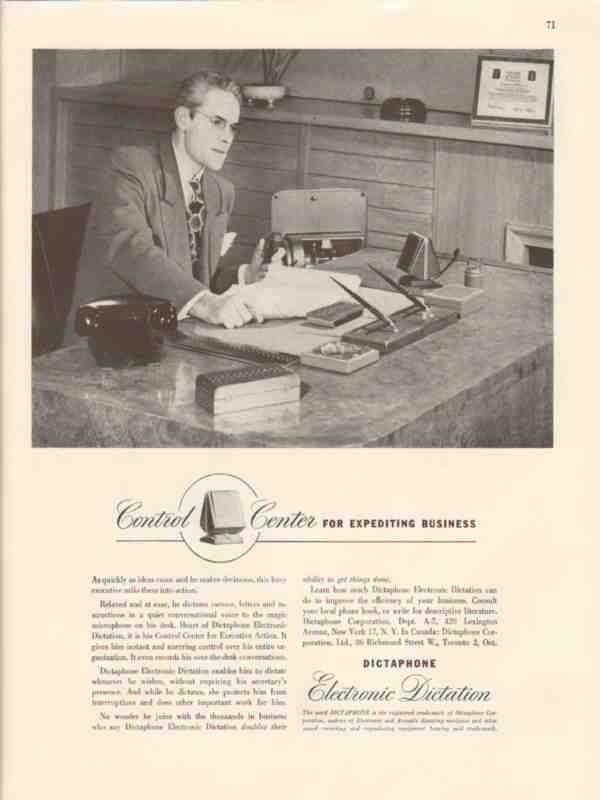 Original old business office equipment industry trade magazine ad for DICTAPHONE CORPORATION of New York City, NY. Control Center for Expediting Business. Heart of Dictaphone Electronic Dictation is the Control center for Executive Action. This 1947 magazine advertisement would display beautifully matted and framed.