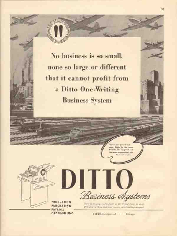 Original old office equipment industry trade magazine ad for DITTO, INCORPORATED of Chicago, IL. No Business is so Small, None so Large or Different that it Cannot Profit from a Ditto One Writing Business System. This 1947 magazine advertisement would display beautifully matted and framed.