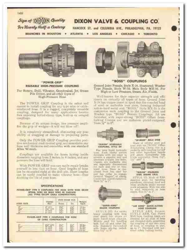 Products include Power-Grip Reusable High-Pressure Coupling, Boss Couplings, Dixon Hydraulic Coupling, Super-King Shank Coupling, LP-Boss Male Stem, Dixon Stainless Steel Shank Coupling and Air-King Quick-Acting House Coupling, all are fully featured.