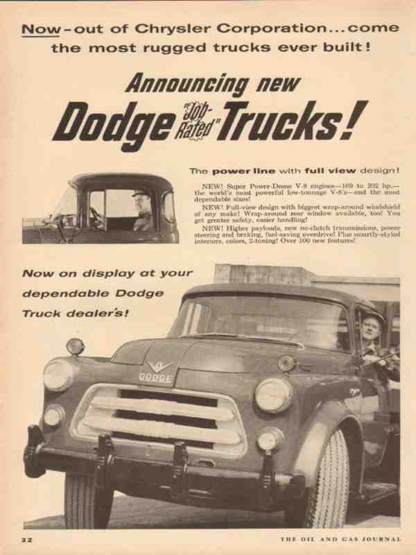 Original old petroleum trucking trade magazine vintage ad for DODGE. Chrysler Corporation Super Power-Dome Rugged Trucks. This unique 1955 oil and gas transportation advertisement would display beautifully matted and framed.