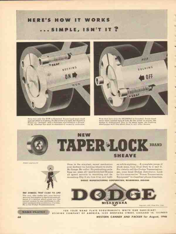 Original vintage food packing industry trade magazine ad for DODGE MANUFACTURING CORPORATION of Mishawaka, IN. Here's How It Works. Simple, Isn't It? The New Taper Lock Brand Sheave. Old 1946 canning and processing advertisement.