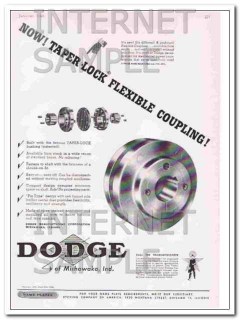 Original vintage industrial magazine ad, for DODGE MANUFACTURING CORPORATION of Mishawaka, IN. Taper Lock Flexible Coupling. Semi-steel. Old dated 1948 industry advertisement. (The scan shows a slight pink tint that is not on the actual ad.)
