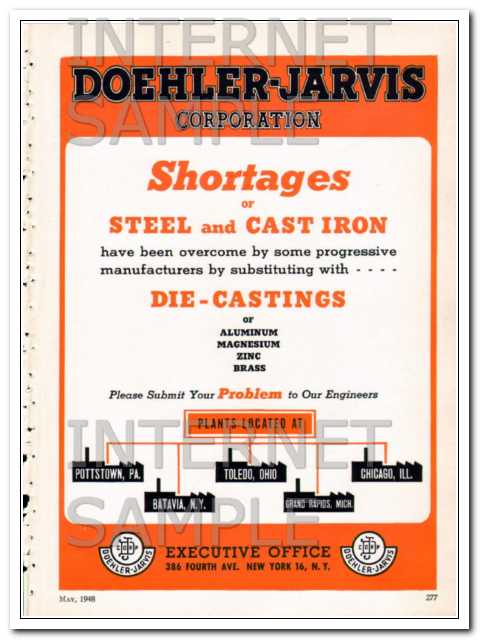 Original vintage industrial magazine ad for DOEHLER-JARVIS CORPORATION of New York City, NY. Shortages of Steel and Cast Iron have been Overcome by some Progressive Manufacturers by Substituting with Die-Castings of Aluminum, Magnesium, Zinc, Brass. Submit Your Problem to Our Engineers. Old 1948 industry advertisement. Would display magnificently matted and framed!