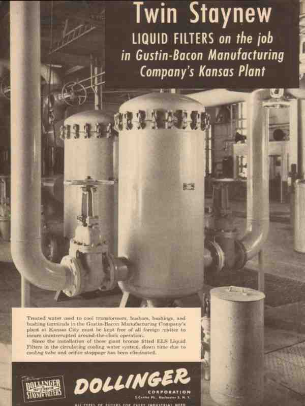Original vintage oil and gas trade magazine ad for COLLINGER CORPORATION of Rochester, NY. Twin Staynew Liquid Filters on the Job in Gustin-Bacon Manufacturing Company's Kansas City, Kansas Plant. ELS Liquid Filters. Old 1954 petroleum industry oilfield and refinery advertisement.