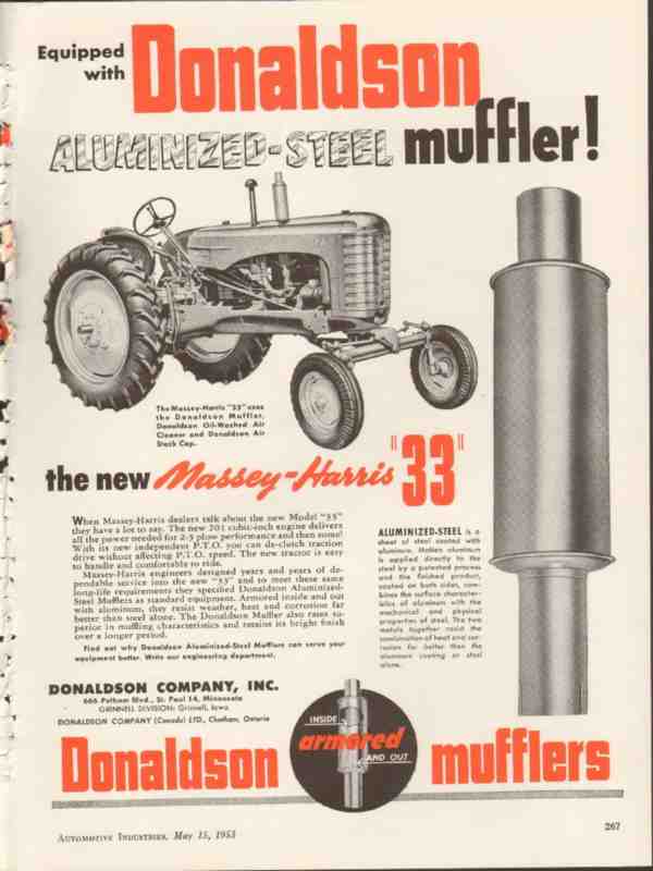 donaldson co 1953 massey harris 33 aluminized steel muffler vintage ad