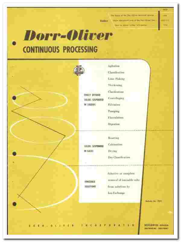 Products include the Dorr Agitator, Dorr Slurry Mixer, Dorr Classifier, Dorr-Oliver 'DSM' Screen, Dorco Bowl Desiltor, Dorr Hydroseparator, Dorrco Sizer, Dorrclone, Dorrclone (Type 'TM'), Dorrco Slacker, Dorr Thickeners, Dorr Tray Thickeners, Merco Centrifugal Separator, Mercone Centrifugal Screen, Oliver Chemical Filter, Oliver Vacuum Precoat (Open), Oliver Vacuum Precoat (Hooded), Oliver String-Discharge Filter, Oliver Top-Feed Filter, Oliver Horizontal Filter, American Filter, Dorrco Filter, Oliver Precoat (Continuous Pressure), Sweetland Filter, Kelly Filter, Oliver Pressure Filter, Oliver Type 'L' Pump, Olivite Pump, Oliver Diaphragm Slurry Pump, Dorrco Type-Y Pump, Dorrco Type-W Pump , Dorrco Flocculator, Dorr Clarifier, Dorrco Hydro-Treator, Dorrco Aldrich Perifilter System, Dorrco Clari-Flocculator, Dorrco Distributor, D-O Aerator, Dorr Digester, Dorrco Vacuator, Oliver Sludge Dewaterer, Dorrco Flocculator, Dorr Clarifier and Dorrco Fluosolids Systems, all are fully featured.