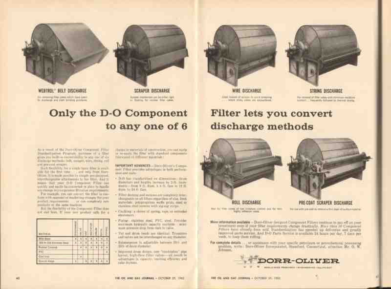 Original oil and gas trade magazine vintage ad for DORR-OLIVER INC, of Stamford, CT. The D-O Component Filter lets you convert to any one of 6 discharge methods. Webrol belt, scraper, wire, string, roll, and pre-coat scraper discharge. It is made possible by simple, pre-designed, interchangeable attachments to the filter. Provides advantage in both performance and costs. This unique 1962 petroleum refining process equipment magazine advertisement would display beautifully matted and framed. Two page gatefold advertisement.