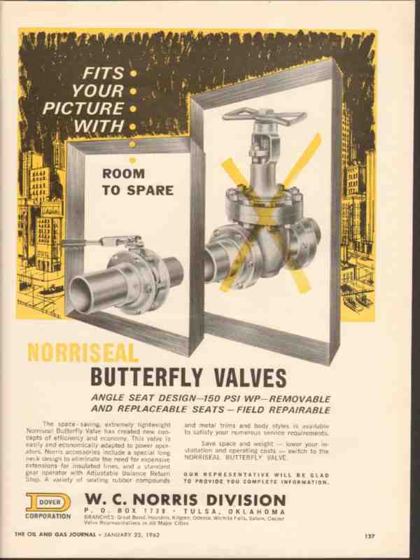 Original oil and gas trade magazine vintage ad for DOVER CORPORATION of Tulsa, OK. W.C. Norris. Fits Your Picture With Room to Spare. Norriseal Butterfly Valves. This unique 1962 oilfield petroleum pipe line equipment magazine advertisement would display beautifully matted and framed.