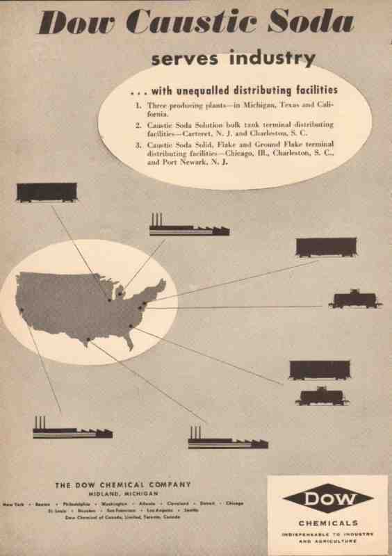 Original oil and gas trade magazine vintage ad for DOW CHEMICAL COMPANY of Midland, MI. Dow Caustic Soda serves industry with unequaled distributing facilities. Three producing plants in Michigan, Texas and California. This unique 1950 old petrochemical magazine advertisement would display beautifully matted and framed.