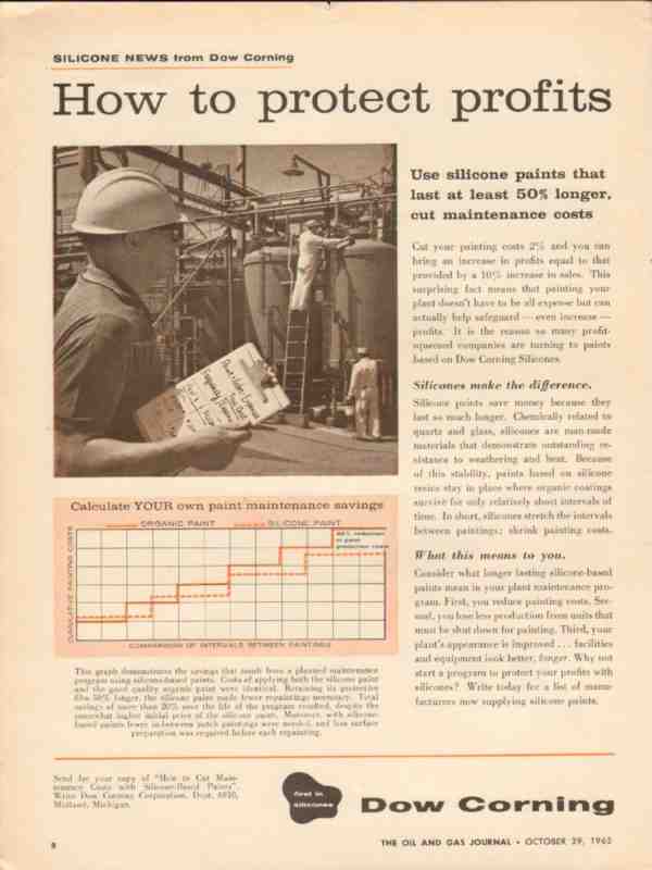 Original oil and gas trade magazine vintage ad for DOW CORNING CORPORATION of Midland, MI. How To Protect Profits. Use Silicone Paints that Last 50 Percent Longer, Cut Maintenance Costs. This unique 1962 old petroleum equipment paint magazine advertisement would display beautifully matted and framed.