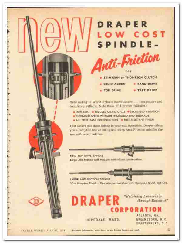 Draper Corp 1954 vintage textile ad spindle top drive anti-friction
