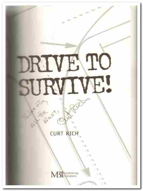 Soft covered book titled DRIVE TO SURVIVE by Curt Rich, 1998. Necessary reading for all drivers who want to survive the ravages of the modern day road! 128 pages. Signed by the author. ISBN 0-7603-0525-0