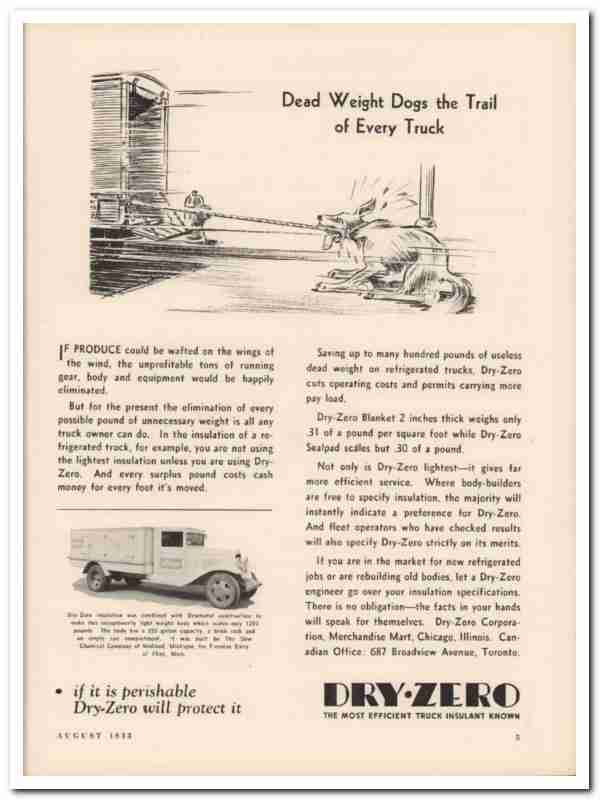 Original ice cream trade magazine vintage ad for DRY-ZERO CORPORATION. Main office was located in the Merchandise Mart, Chicago, IL. Freeman Dairy of Flint, MI. ice cream truck is pictured. It was built by the Dow Chemical Company of Midland, and uses Dry-zero insulation. Dead weight dogs the trail of every truck. Saving up to many hundred pounds of useless dead weight on refrigerated trucks, Dry-Zero cuts operating costs and permits carrying more pay load. This unique 1933 old dairy industry magazine advertisement would display wonderful matted and framed. Nice graphics.