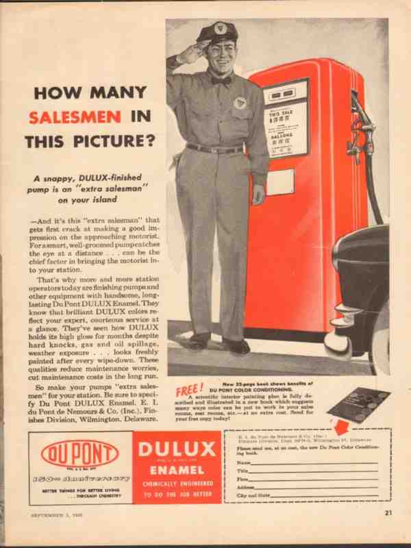 Original oil and gas service station industry trade magazine vintage ad for E. I. DU PONT DE NEMOURS AND COMPANY of Wilmington, DE. How Many Salesmen in This Picture? A snappy Du Pont Dulux Enamel Finished Gasoline Pump is an Extra Salesman on your island. Old 1952 gasoline service station fuel pumps magazine advertisement.