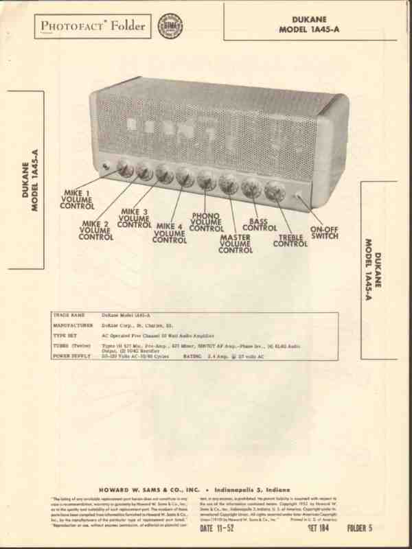 dukane model 1a45-a 50 watt audio amplifier sams photofact manual