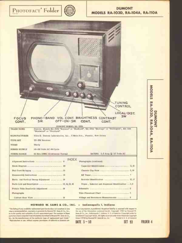dumont model ra-103d 104a 110a fm tv receiver sams photofact manual
