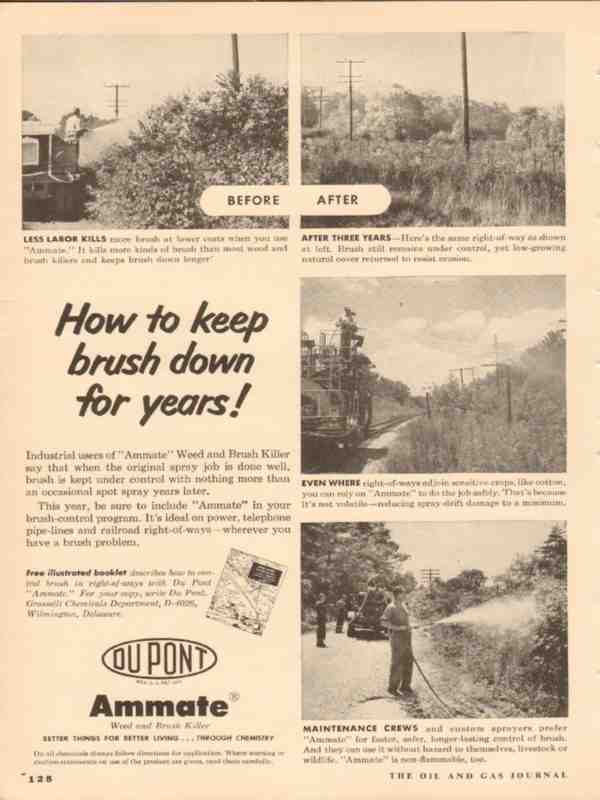 Original vintage oil and gas trade magazine ad for DUPONT of Wilmington, DE. Ammate Weed and Brush Killer. How to Keep Brush Down for Years. Ideal on power, telephone, pipelines and railroad right of ways. Old 1954 petroleum industry oilfield and refinery advertisement.