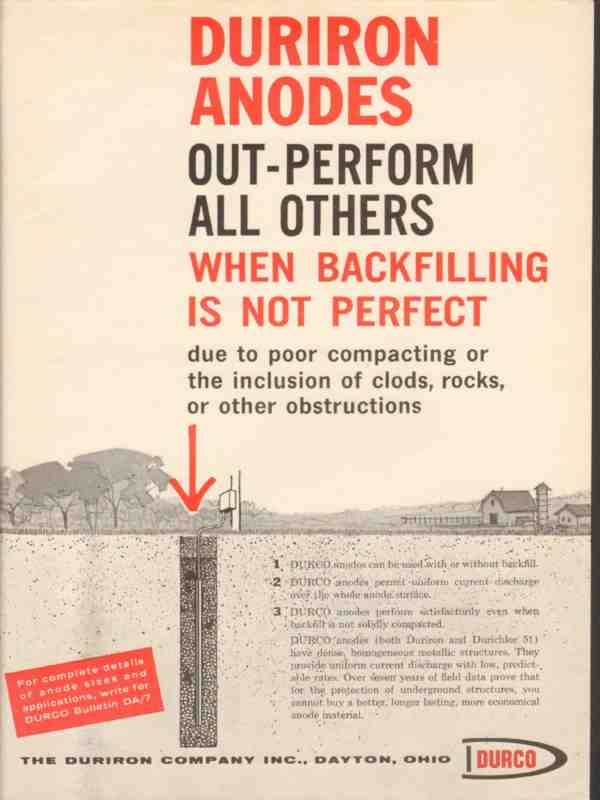 Original oil and gas trade magazine vintage ad for THE DURIRON COMPANY, INC of Dayton, OH. Duriron Anodes Out Perform all Others When Backfilling Is Not Perfect due to poor construction or the inclusion of clods, rocks, or other obstructions. Durco. This unique 1962 old oilfield petroleum drilling rig equipment magazine advertisement would display beautifully matted and framed.